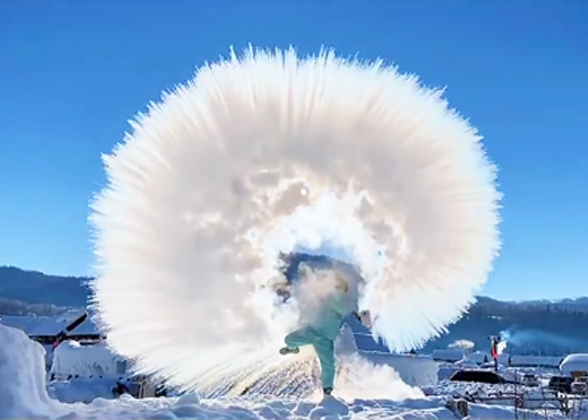 This super popular activity in Northeast China has gained widespread popularity on WeChat Moments and Douyin. When you lift and swing your arms to splash water under the sun, magic happens: the water instantly freezes in the low outdoor temperature, forming a beautiful arc of ice around you—both stunning and thrilling.