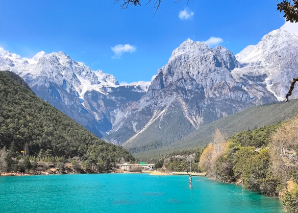 Afterwards, we will visit Jade Dragon Snow Mountain again, followed by the Little Jiuzhaigou known as the "Fairy's Remaining Fields" — Blue Moon Valley. Formerly widely known as Baishui River, Blue Moon Valley is also called Baishui River. On sunny days, the water appears blue, and the valley is shaped like a crescent moon. From a distance, it looks like a blue moon embedded at the foot of Jade Dragon Snow Mountain, hence the name Blue Moon Valley.