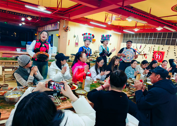 In the afternoon, we will travel to Chuxiong by bus. As we adapt to local customs, we will step into the Yi Ethnic Tribe and take part in the elaborately arranged Yi-style grand celebration—the Long Street Banquet—to experience the local customs. We will taste distinctive Yi ethnic cuisine: the rich flavor of the hot pot, the incredibly refreshing Tuotuo Meat and buckwheat cakes that leave a lasting aftertaste, and mellow Yi homemade wine. Bold toasting songs fully display the forthrightness of the Yi people, and simple smiling faces convey the fiery passion of the Yi youth. Afterward, we will check into the hotel and rest.