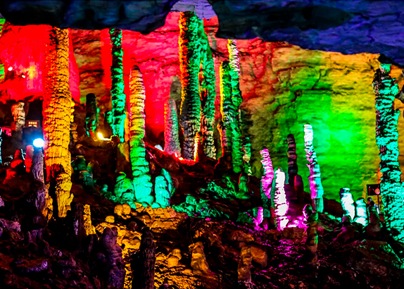 Evening: Visit Huanglong Cave, the "All-around Champion of World Caves." Explore this underground palace and its signature landmark, the "Sea-Calming Needle" stalagmite—insured for 100 million RMB. Take a boat ride on the Xiangshui River, a 2,820-meter subterranean river that stays at $16^\circ\text{C}$ year-round, making it a perfect sanctuary for the endangered Giant Salamander.