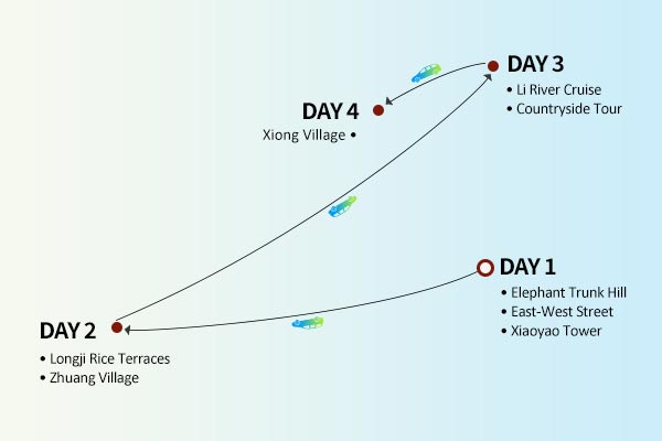 Iconic Guilin landmarks—Elephant Trunk Hill (resembles an elephant drinking) shows karst charm; Xiaoyao Tower offers evening views of the city’s old-town vibe, paired with East-West Street’s local snacks.