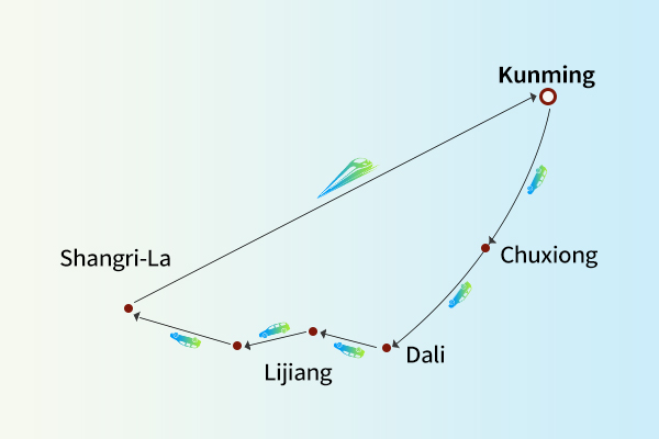 After lunch, drive back to Lijiang, then take a high-speed train to Kunming and check in at the hotel (Yunyi Duo Hotel, Lamute Hotel, Elong Wanguo Hotel, Elong Yitang Hotel, Zhongde Hotel, Huadu Hotel, City Comfort Inn, or similar; during peak season, if train tickets are unavailable, the return may be adjusted to overnight train from Lijiang, high-speed train from Dali, or coach transfer, with fare differences refunded accordingly).
