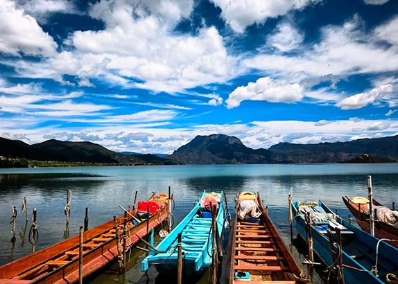 After breakfast, depart for Lugu Lake, the "Kingdom of Daughters" and home to the matrilineal Mosuo people. Due to the long journey, lunch will be served en route. Upon arrival, head to the Viewing Platform for the best panoramic view of the entire lake. Next, board a traditional Mosuo Pig-trough Boat to cruise the crystal waters and visit the scenic Liwubi Island, known for its vibrant birdlife and flowers. Afterward, enjoy a Scenic Drive around the Lake to witness the stunning reflection of clouds on the water and gaze up at the majestic Gemu Holy Mountain.