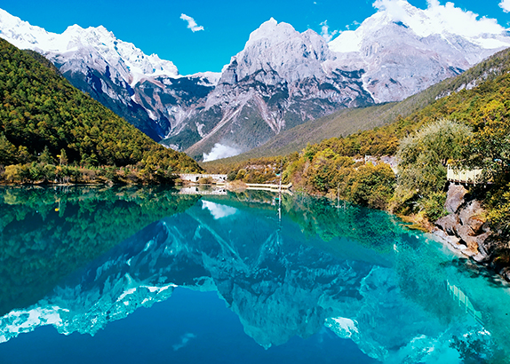 Afterward, visit Blue Moon Valley (Sightseeing bus 60 RMB/person at your own expense), where melting snow from the peaks forms a crystal-clear, turquoise river. On sunny days, the moon-shaped valley sparkles like a blue gem nestled at the mountain's base. Finally, head to Lijiang Ancient Town to explore its iconic small bridges, flowing streams, and cobblestone paths. During your free time, immerse yourself in the town's laid-back atmosphere and sample local treats like Lijiang Baba or Naxi rice cakes for dinner (×). After your exploration, return to the hotel independently.