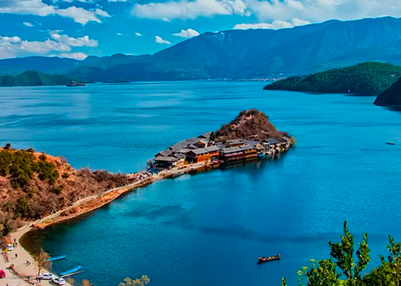 After breakfast, visit a traditional Mosuo village for a Mosuo Cultural Home Visit. Sit around the sacred hearth with a Mosuo matriarch (Ama) to hear stories of their unique "Kingdom of Daughters" and learn about the customs of their matrilineal clan culture. Next, proceed to Lovers' Beach, a romantic stretch of shallow shoreline with crystal-clear waters and long piers that extend into the lake, framed beautifully by weeping willows.