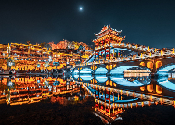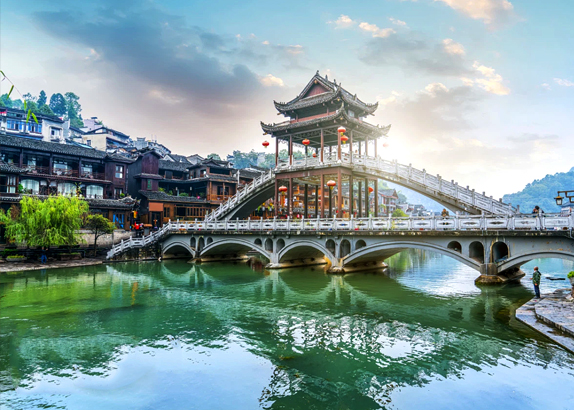 After lunch, travel by bus to Fenghuang Ancient Town. After checking in, immerse yourself in the intoxicating Fenghuang Night View along the Tuojiang River. During the evening, you will enjoy local specialty cuisine, participate in the traditional "High Mountain and Flowing Water" toasting ceremony, sing folk songs with the local Miao people, and watch non-heritage Miao drum performances.